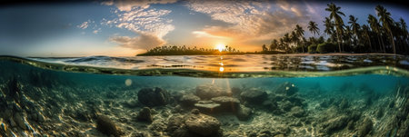 Panorama of the underwater surface of a tropical island with palm trees at sunset