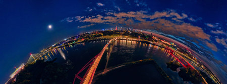 Beautiful panoramic aerial drone night sunset view to the new pedestrian and bicycle bridge connecting the banks of the Vistula, Warsaw, Poland, EU.