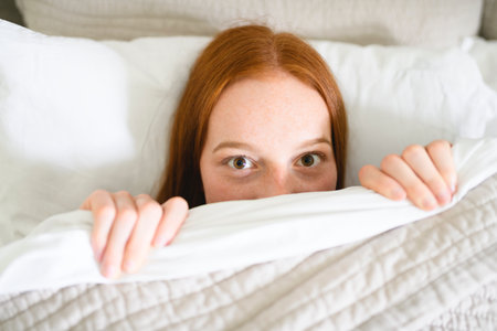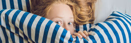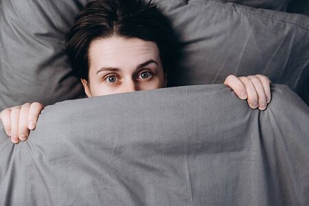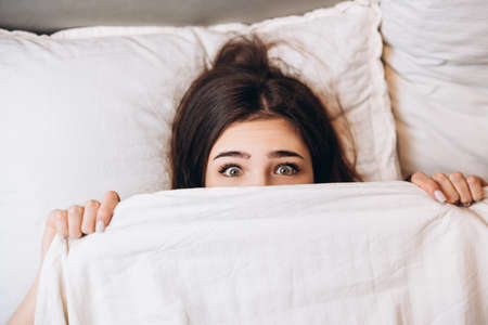 model woman hiding under the blanket. Young woman is very scared. Woman with big open eyes in bed