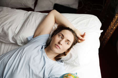 Beautiful woman dreaming about vacation. Girl looking aside to the window and laying in the bed.