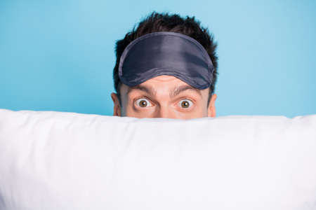 Close-up portrait of nice funny amazed guy hiding behind soft pillow having fun spy pry isolated over bright blue color background