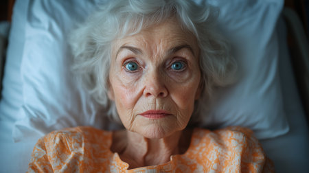 Elderly elegant Caucasian patient with gray hair lies in bed in a hospital ward