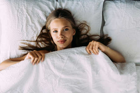 young woman sleeping on the white linen in bed at home, top view