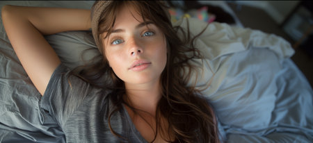 Young Woman Relaxing on Bed With Grey Shirt and Long Brown Hair