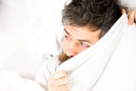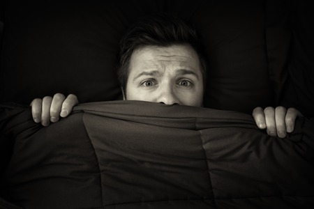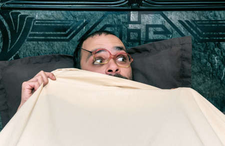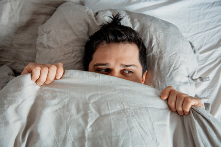 dramatic portrait of stressed and scared man alone in bed awake at night in fear after having a nightmare feeling paranoid holding the blanket in funny panic face expression