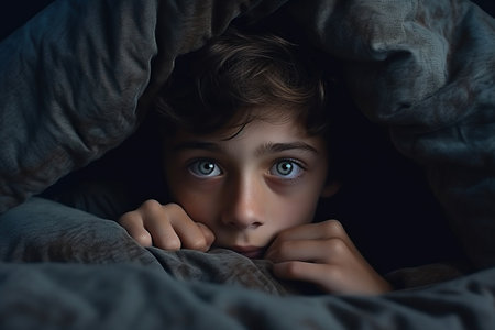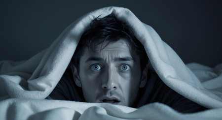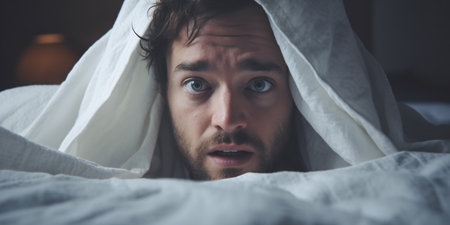 AI Generated. Fearful Man Hiding Under Blanket at Night