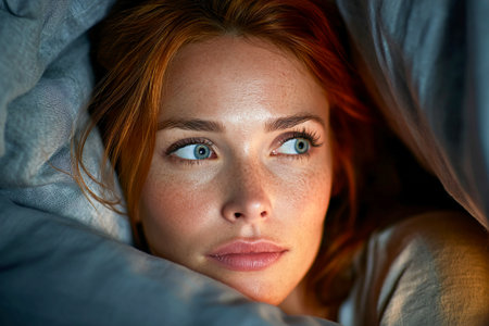 A close-up portrait of a woman in bed expresses intense emotions of fear and anxiety. Her hands rest on her head as she contemplates her thoughts in peaceful morning light.