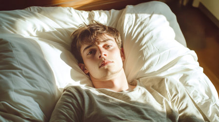 Yound man wake up in a bed at home and hiding . Candid above view