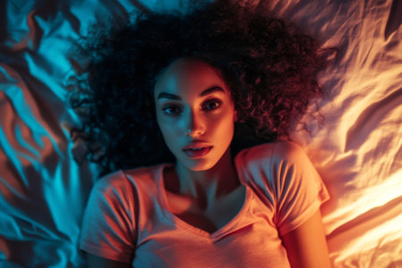 A sleepless young woman's portrait as she lies in bed, eyes wide open in the darkness.