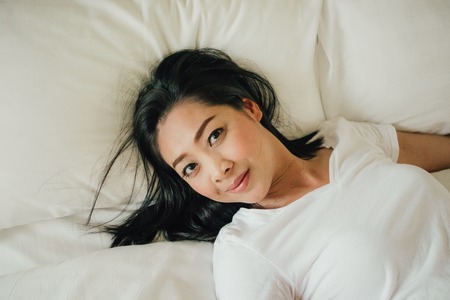Happy asian woman relax on her bed in the morning.