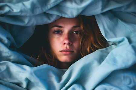 A young woman lies awake in bed, surrounded by blankets, with a worried expression on her face. She stars into the distance, unable to sleep at night.