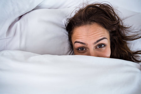 Woman peeking out from under a pillow in bed with wide open eyes, concept of insomnia and stress