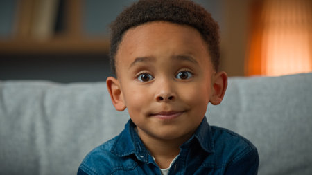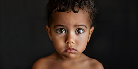 Portrait cute African American ethnic multiracial multiethnic child small boy pupil son baby toddler serious 7 years kid looking at camera upset facial expression