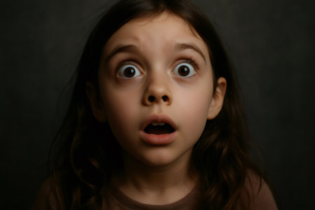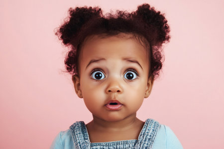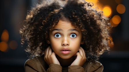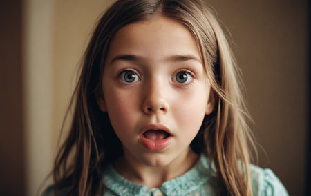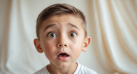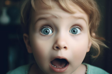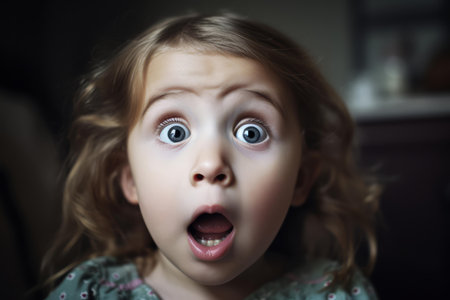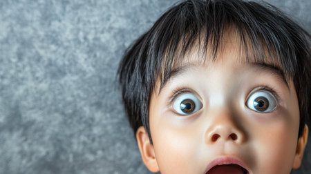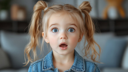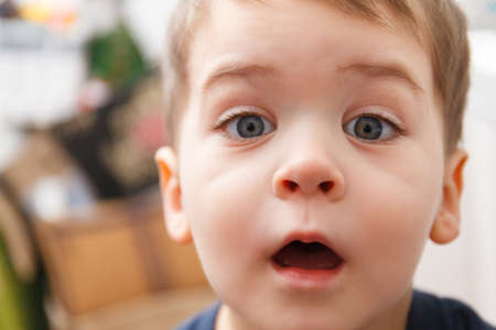 surprised kid in bedroom. child's eyes widened in amazing. copy space for your text