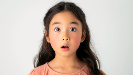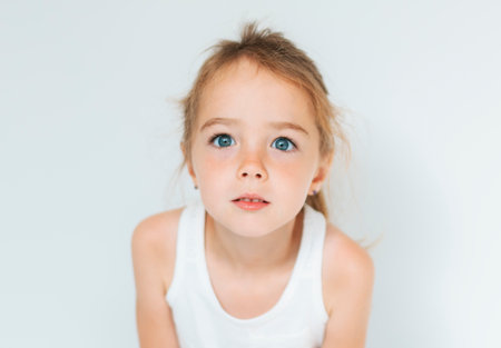 A portrait of a funny young pretty emotional surprised girl. Kids summer casual fashion, beauty, emotions.