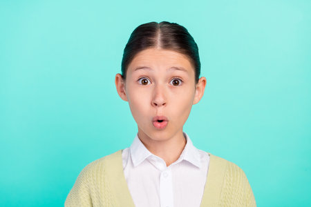 Photo of shocked surprised lady open mouth gossip news concept wear green top cardigan isolated teal color background