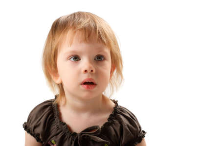 Little beauty girl terrifically wonder and open her mouth. She seeing smb interesting from the right of photographer.