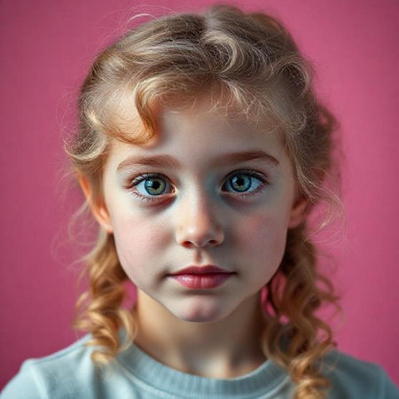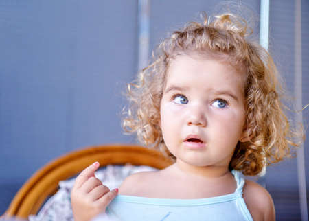 Little girl with blond curly hair and blue eyes. Portrait of a cute child.
