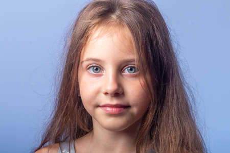 Portrait of a little beautiful girl with long hair. In a gray dress with sequins on a light background. Front view.