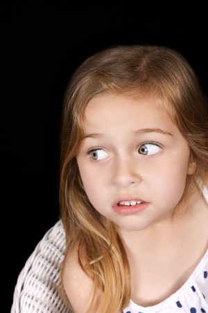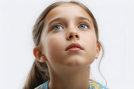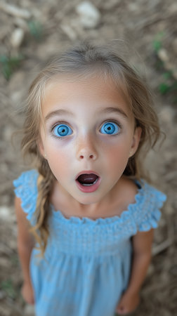 Beautiful little girl the blonde with huge blue eyes looking up in fear, wonder and amazement