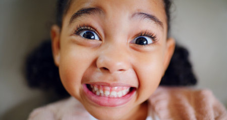 Excited, portrait and smile of girl child in studio for emotions, expression or reaction to good news. Optimism, teeth and youth with happy kid on gray background for development, growth or surprise