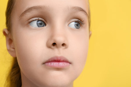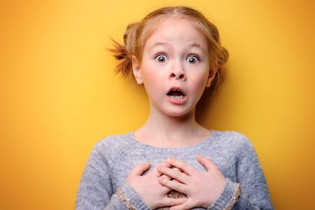 Close-up portrait of a funny emotional girl making faces at camera. Studio shot over yellow background. Childhood concept.