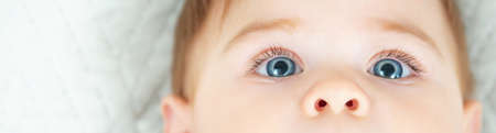 Close-up portrait of baby boy with beautiful blue eyes and long eyelashes. Baby eyes detail photo. Panorama, banner.