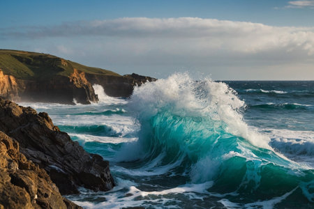 The rugged coastline is a symphony of crashing waves and jagged cliffs, where natures forces collide to create a breathtaking panorama of raw beauty.. AI generated.