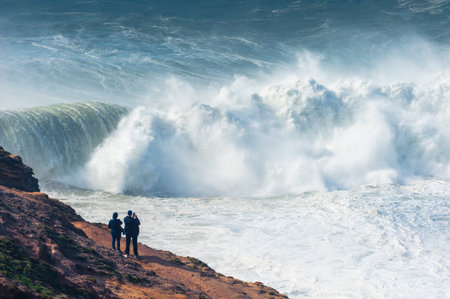 Big waves season in winter in Nazare, Portugal. People watching the waves from the cliffs. Atlantic ocean coast at windy sunny day