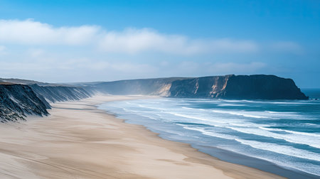 A breathtaking coastal landscape featuring soft waves crashing onto a sandy beach, surrounded by cliffs under a blue sky, perfect for tranquil escapes.