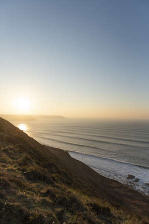 Beautiful landscape image of view from Hartland Quay in Devon England durinbg moody Spring sunset