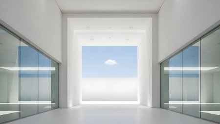 An expansive minimalist art gallery featuring sleek lines and bright lighting, perfect for showcasing various artistic exhibits in a contemporary environment.