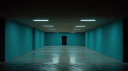 Eerily symmetrical, long, narrow indoor space featuring vibrant teal blue walls, a concrete floor with reflective qualities, and a low ceiling dotted with parallel rows of bright, rectangular overhead lighting fixtures, leading towards a single dark doorway at the far end.