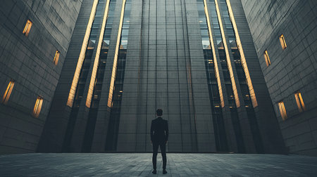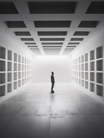 A single person standing in the center of a large empty room their eyes scanning the walls.. AI generation