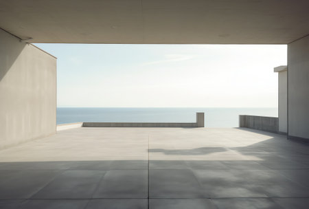 Empty concrete footpath with building wall landscape on sea background. 3d rendering.