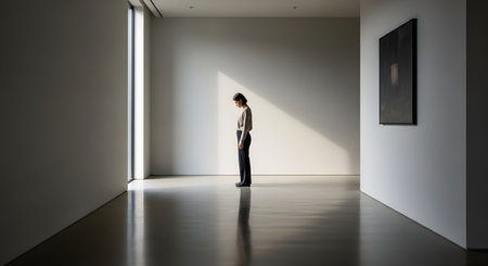 A woman stands alone in a spacious, minimalist room with a large window and a single piece of abstract art, looking down in contemplation. The scene is illuminated by natural light casting soft shadows, evoking feelings of solitude, reflection, or sadness.