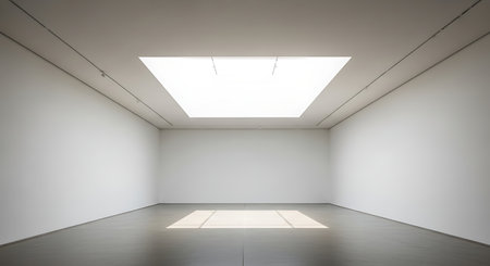 A pristine, empty modern art gallery featuring a large rectangular skylight illuminating the polished concrete floor, creating a serene and minimalist architectural space ideal for exhibitions.