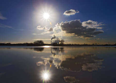 Power Station and smoke cloud viewed across a calm reflective lake.