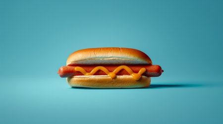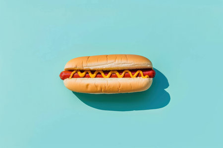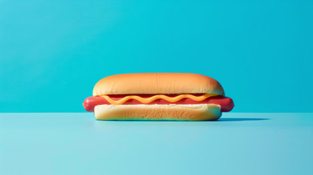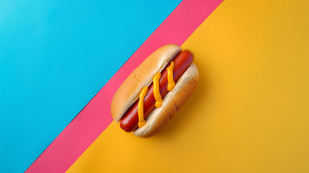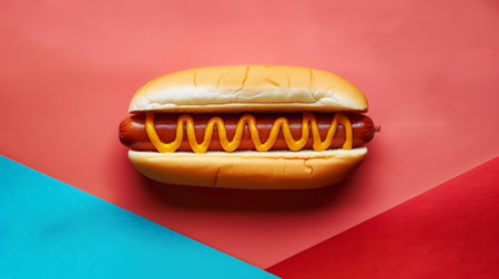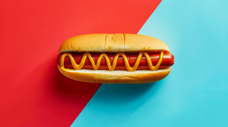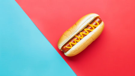 Delicious aesthetic hot dog in bun with mustard, copy space. Split blue and red background. Street food. Generative AI