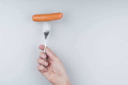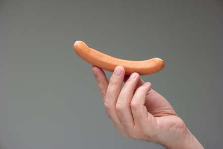 Caucasian male hand holding a bratwurst dog between fingers isolated on gray background.
