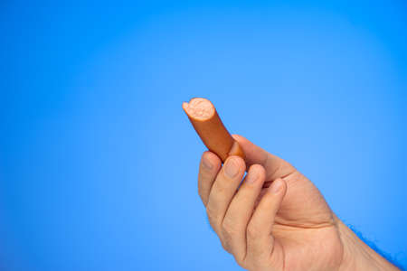 Raw Frankfurter wurst held in hand by Caucasian male hand isolated on blue background.
