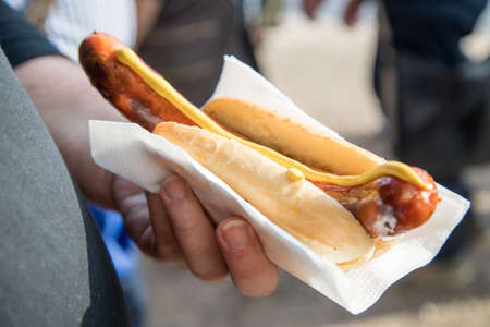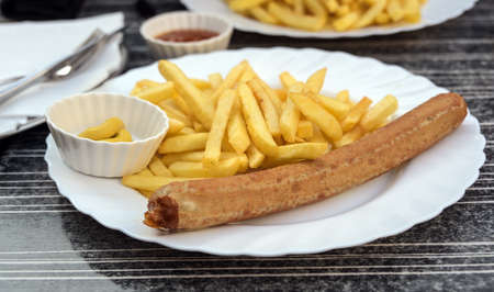 German Bratwurst or grilled sausage with French fries, mustard and ketchup on a plate in a street restaurant, unhealthy fast food, selected focus, narrow depth of field
