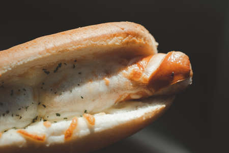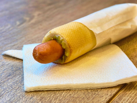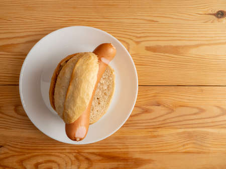 Boiled sausage with a bun on a wooden background. Bockwurst with a bun.