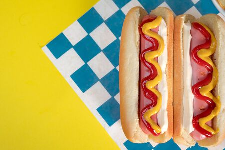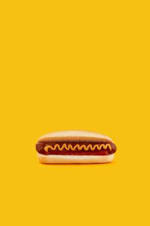 Classic hot dog with wurst, ketchup and mustard on orange background. Menu for restaurant