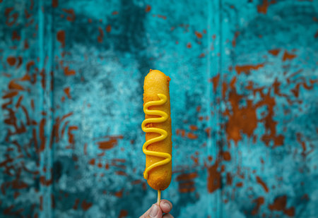 Single corn dog with a perfect swirl of mustard against a vibrant blue backdrop