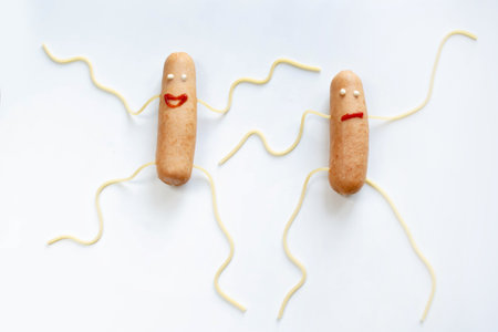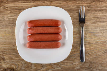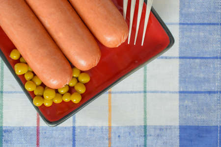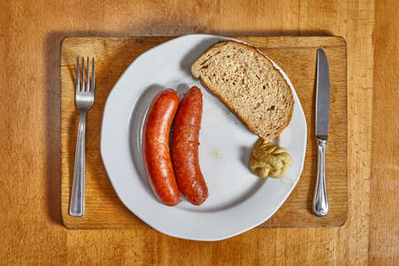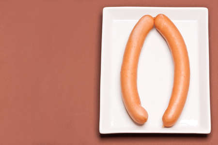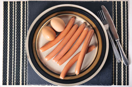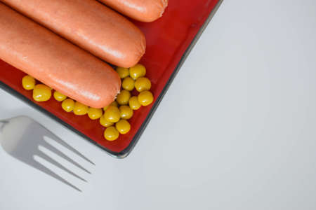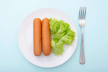 Boiled sausages on white ceramic plate with green, morning breakfast, top view, lay out