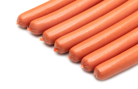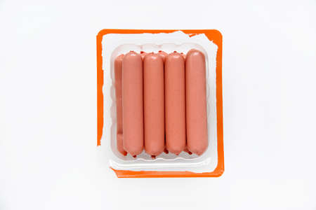 Juicy meat sausages in plastic packaging on a white background. Sausages in the group. Meat semi-finished product in a package.