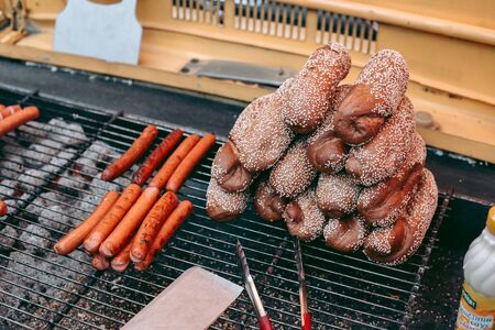 Cooking sausages in the oven. Fast food street. Fried sausages