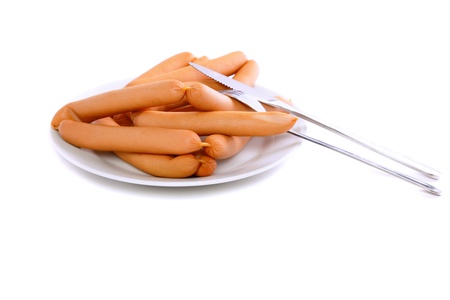 A fresh sausage on white plate with fork and knife. Isolated over white.