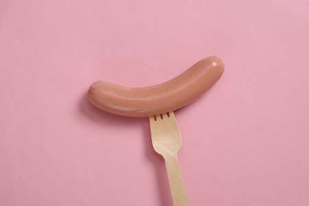 Sausage on a wooden fork. Minimalism food and eco concept. pink background